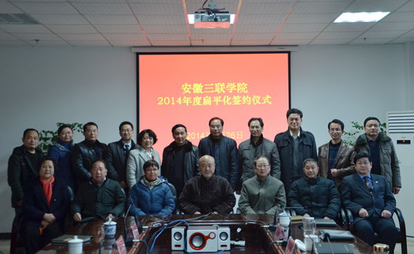 1月26日下午,学院举行了2014年度扁平化管理责任书签约仪式。院长金会庆教授分别与9个系(院)的扁平化管理责任人签订扁平化目标责任书,并作重要讲话。会议由常务副院长金美莲主持,在肥院领导参加会议。
