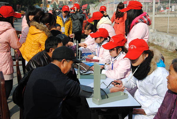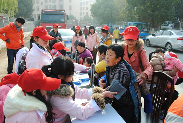 青年志愿者协会的志愿者们与锦绣社区和方兴社区建立“健康服务站”为居民测血压、提供健康咨询