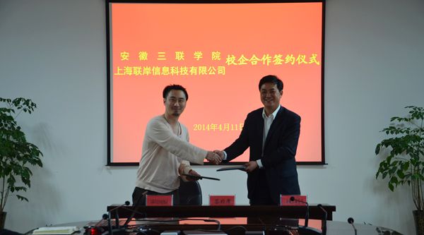 4月11日,安徽三联学院与上海联岸信息科技有限公司校企合作签约仪式在图书馆518会议室举行。上海联岸信息科技有限公司董事长金磬、安徽三联学院副院长姜发根出席仪式。