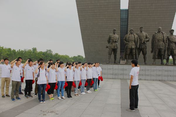 社会实践团队一行36人在渡江战役五大前委的雕塑下,整齐而又洪亮的重温入团誓词。
