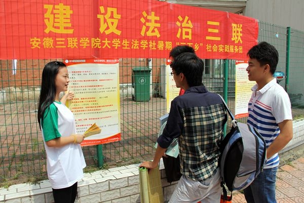 为祖国勤学修德,以实践明辨笃实。2014年“江淮普法行”活动日前拉开帷幕,我校大学生法学社暑期”三下乡”社会实践服务团围绕“培育法律信仰,建设法治安徽”为主题,通过多种形式,开展系列普法宣传活动。