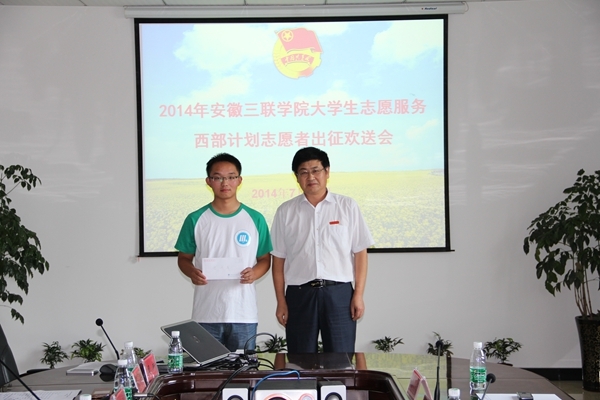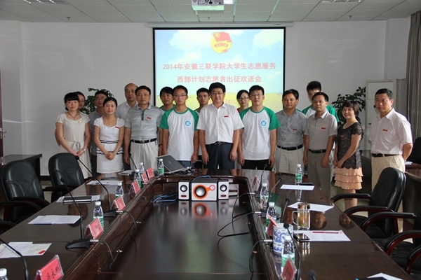 7月15日下午,2014年大学生志愿服务西部计划志愿者出征欢送会在T518会议室举行。校党委副书记鲁先长,学生处、教务处、就业实训处、团委负责人,电子电气工程学院、计算机工程学院党、团总支书记、2014年入选的西部志愿者及其辅导员加了欢送会。欢送会由团委负责人主持。