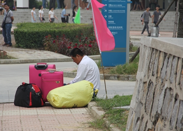 热情的保安为新生指路,校园随处可见的指路牌为新生报到提供便利
