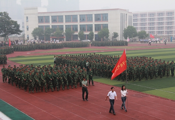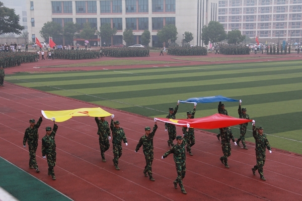 新生方阵在各二级学院院长的带领下,向主席台昂首走来,接受检阅。全体新生身着迷彩服,个个精神抖擞,迈着整齐划一的步伐,喊着嘹亮励志的口号,向金校长及与会领导展示军训成果。