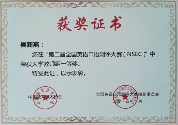 近日,我校外语学院吴新燕老师在“第二届全国英语口语测评大赛(NSEC)”中荣获大学教师组一等奖。