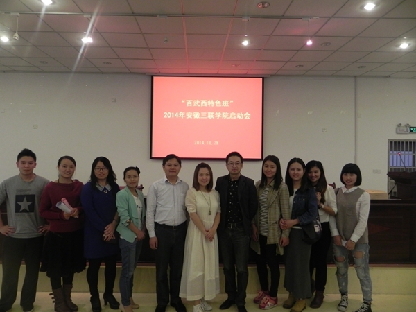 10月28日,“百武西特色班”2014年安徽三联学院启动会在B01学术报告厅举行。百武西公司副总经理、设计总监吴可,人力资源主管金玉梅来到我校为同学们作了宣讲,与同学们进行了互动。启动会由就业实训处处长赵立如主持。