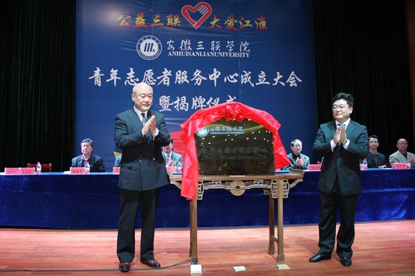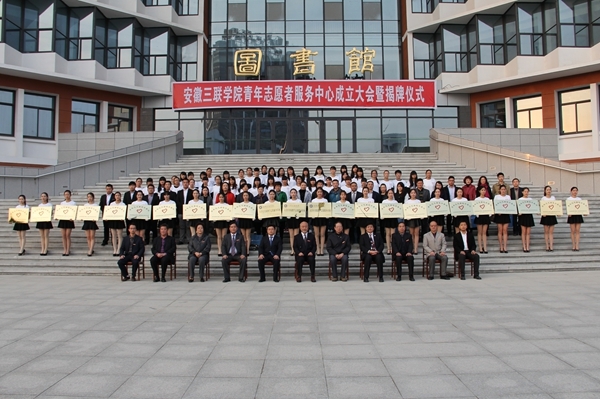 随后校党委书记桂宁东宣读中心成立及任命文件、校团委副书记李燕介绍中心基本情况。在悠扬的音乐声中,团省委副书记李国阳、校长金会庆步入台前共同为安徽三联学院青年志愿者服务中心揭牌,各二级学院负责人、志愿服务合作基地单位领导及我校学生代表共同为志愿服务合作基地揭牌。