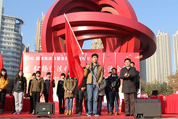 在首个国家宪法日暨第十四个全国法制宣传日来临之际,由合肥市普法办举办的合肥市高校普法志愿者联盟授旗仪式于12月4日上午在和平广场举行,来自我校和安徽大学、合肥工业大学等九所高校的大学生法学社团参加了此次授旗仪式。合肥市司法局刘晓文局长向安徽省青少年法律志愿者服务中心成员、我校大学生法学社社长张成同学授旗。