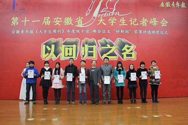 上午九时,合肥学院党委宣传部部长白义香宣布峰会开始,安徽省教育厅思政处副处长王后林及合肥学院领导洪家友先后发表讲话阐释主题,此外,峰会特别安排主题释义表演,多角度对主题进行释义。随后颁奖嘉宾颁发校园“好新闻奖”、校园“十佳学生记者”及安徽青年报“双十佳”奖项,我校大学生记者团成员喜获佳绩:倪龙天获《安徽青年报》十佳记者,胡蓉获“好新闻奖”消息类二等奖,何欢获“好新闻奖”通讯类三等奖,俞叶、疏瑞获主题征文三等奖。