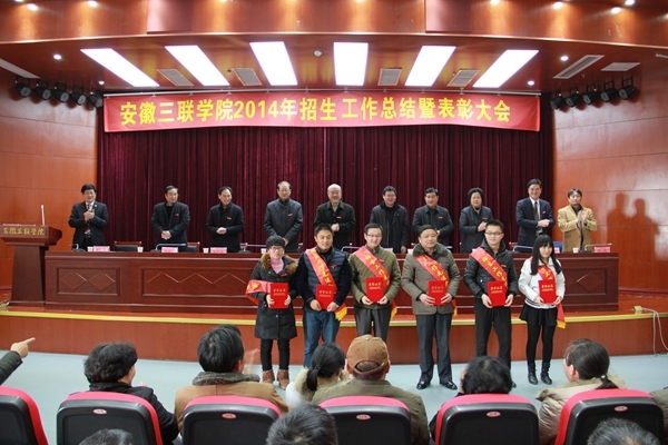 12月30日中午,我校2014年度招生工作总结暨表彰大会隆重举行。安徽三联学院党政领导金会庆、桂宁东、余皖生、鲁先长、秦永元、张树林、曹艳平、王瑞友、姜发根、金哲等出席大会并就座主席台。校长金会庆教授作重要讲话,校党委副书记鲁先长主持大会。