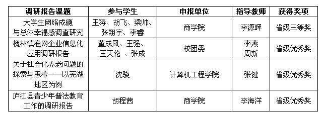另悉,2014年全省大中专学生志愿者暑期“三下乡”社会实践活动优秀调研报告评选同时揭晓,我校推报的由商学院李源晖辅导员指导的《大学生网络成瘾与总体幸福感调查研究》调研报告荣获三等奖,这也是我省民办高校唯一获等级奖的调研报告。《槐林镇渔网企业信息化应用调研报告》、《关于社会化养老问题的探索与思考——以芜湖地区为例》、《庐江县青少年普法教育工作的调研报告》等荣获优秀奖。