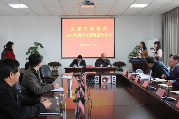 2月14日下午,学校在图书馆518会议室举行了2015年度扁平化管理签约仪式,校长金会庆教授出席仪式分别与8个二级学院的扁平化管理责任人签订目标责任状,并发表重要讲话。校党政领导参加签约仪式。