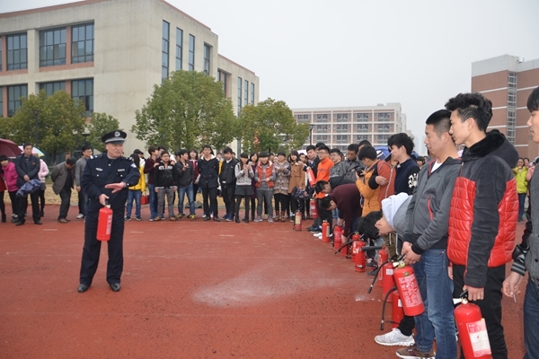 在随后的消防灭火演练阶段,肥西县公安局桃花派出所张宁警官向同学们详细讲解了常见灭火器类型的构造及使用方法。来自各二级学院的24名学生代表积极动手,切身体验,分三组进行了灭火演练。