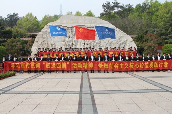 为深入学习宣传贯彻“四进四信”活动精神,倡导青年大学生争做社会主义核心价值观践行者,4月11日,我校组织主要学生干部、各班团支书代表、各学生社团主要负责人等一行90余人,前往合肥爱国主义教育基地—大蜀山烈士陵园,开展爱国主义主题教育和志愿服务活动。