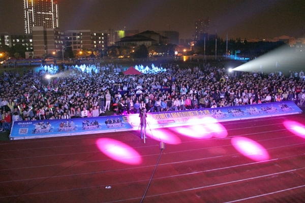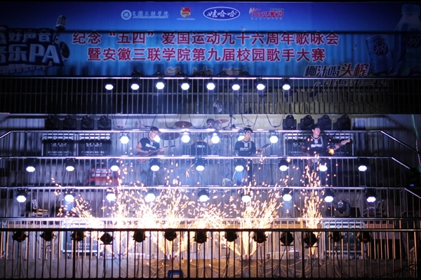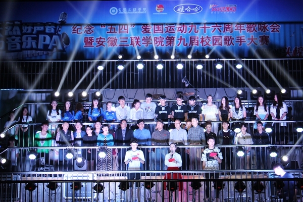 5月4日晚,我校在生活区运动场隆重举行纪念“五四”爱国运动九十六周年歌咏会暨安徽三联学院第九届校园歌手大赛总决赛。校党委副书记鲁先长,副校长王瑞友、金哲,工会主席王坚伟出席此次大赛。此次大赛特邀合肥师范学院团委书记常树宝、新华学院团委副书记吕翔等高校共青团系统人员担任评委。观看大赛的还有学生处、保卫处等相关部门负责人以及各学院党团总支书记、辅导员老师和学生代表近4000人。本次大赛通过网络对现场进行了全程直播。