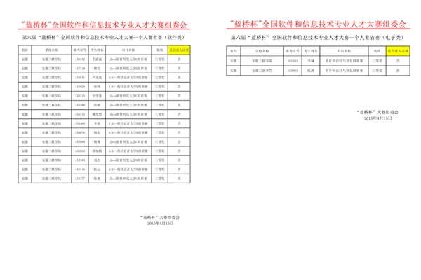 第六届“蓝桥杯”全国软件技术大赛安徽赛区决赛于4月12至13日在安徽财贸职业学院和南航金城学院(南京)举行,来自省内34所高校共计446支队伍参加了比赛,本次比赛分为个人软件组和个人电子组两个组别,我校计算机工程学院副院长张健、朱宁波等教师带领27名学子代表安徽三联学院参加比赛。