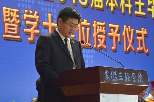红果飘香盈满枝,满园桃李竞芬芳,又到一年毕业时。7月10日,安徽三联学院2015届本科生毕业典礼暨学士学位授予仪式在图书馆多功能厅隆重举行。校长、校学位评定委员会主席金会庆教授,三联集团董事长张方振教授,校党政领导李明阳、姜发根、金美莲、秦永元、曹艳平、王瑞友、金哲,以及各二级单位负责人出席典礼。安徽三联学院2015届近两千名本科毕业生身着学位服,与学院领导、老师、家人一同见证了人生中这一重要时刻。典礼由校党委副书记鲁先长主持。