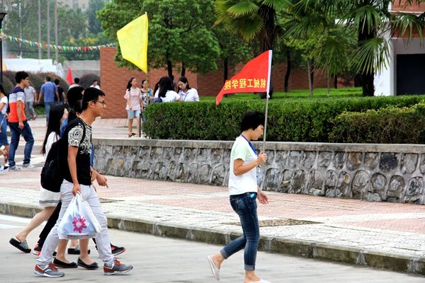 各学院的志愿者手持本学院的小红旗,在回程的校车刚停靠好时,便举着旗子飞奔到校车旁迎接本学院新生,避免新生下车后不知所错。“小红旗”郑畅说:早晨7点就在A楼一楼集合,不论风吹日晒都要以新生报到为重,引导新生更加便捷的完成报到。