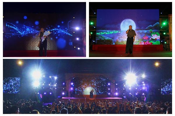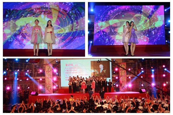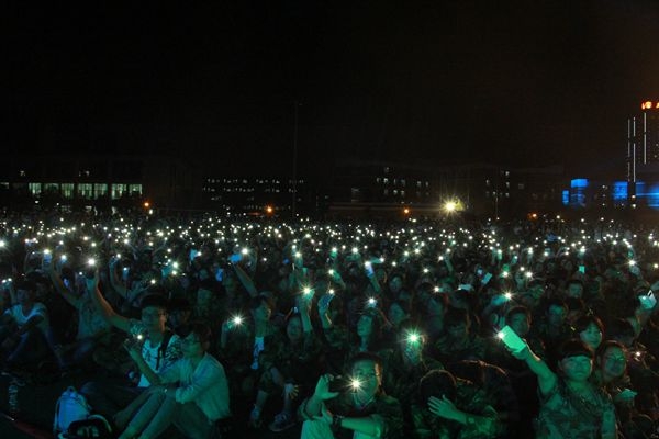 金会庆校长深情独唱《透过开满鲜花的月亮》、《right here waiting for you》,赢得台下广大师生的阵阵掌声,台下学生自发打开手机小灯闪烁挥舞,舞动的“荧光海”是本次晚会的一大亮点。