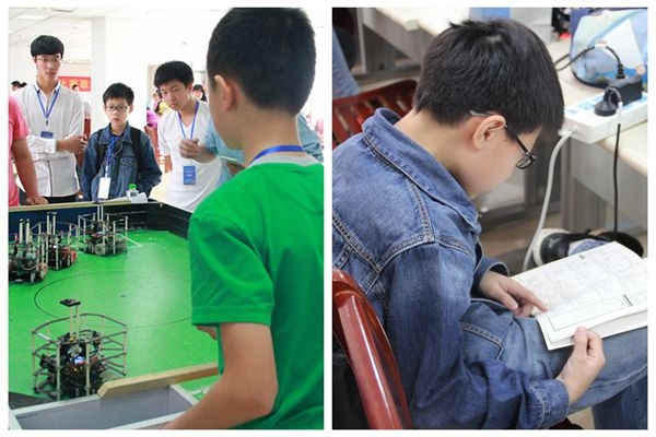 来自合肥45中七年级的郭小凡、刘津仰和张成蹊,小小的年纪,矮矮的个头,赛场上娴熟的技能,彰显了现代中学生的青春与活力。比赛中场休息时,团队中的刘津仰还在钻研机器人相关书籍。刘津仰说:五年级开始与机器人打交道,这是他第三次代表学校参加比赛,之前虽然没有获过奖,但重在参与。队长郭一凡更是辛苦的忙着调试机器人,与其他成员一起操控机器人,团队之间相互合作、齐心协力,丝毫不亚于大学生。