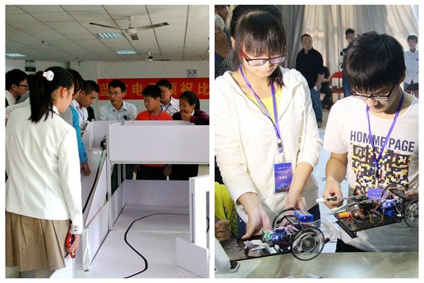 蚌埠一中“智力空间团队1”郑嘉乐、王博璐和王时雨身着白色校服引起了许多人注意,三个干练女生的身影在机器人足球比赛的赛场上穿梭着,丝毫不逊色于男生。她们说:“机器人深深地吸引我们,参加机器人大赛,不仅提高了我们对科学研究的兴趣,而且加强了我们动手能力,不论这次比赛结果如何,我们都会坚持下去。”巾帼不让须眉,她们是一群即将面对高考的高中生,学习之余刻苦钻研机器人方面的知识,祝愿她们能取得满意的成绩。