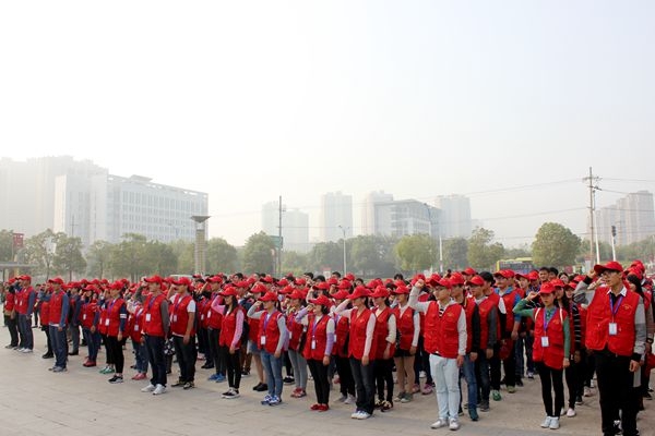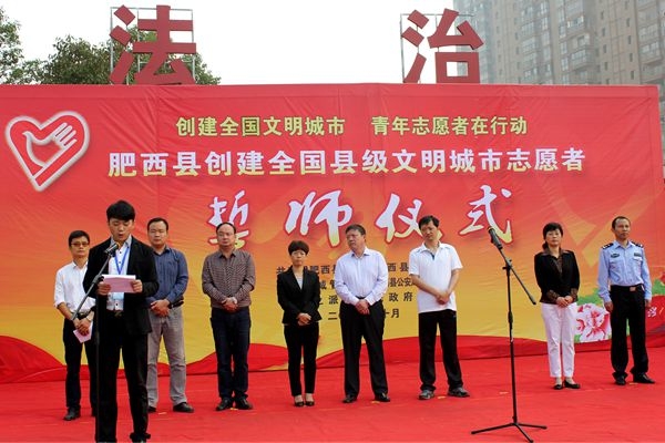 10月24日上午9点,肥西县创建全国县级文明城市志愿者誓师仪式暨青年志愿者服务专题培训在四十埠社区群众文化广场隆重开展,我校团委组织了青年志愿者服务中心的100余名志愿者在团干董熹曦老师的带队下参加了本次仪式。