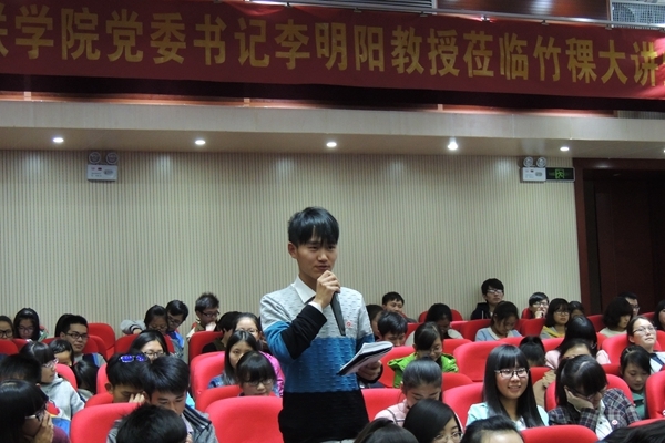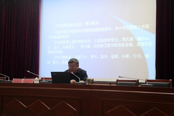 李书记从自然、人生、文化、道德等众多方面讲解了书法的博大精深。首先梳理了汉字的演变过程,从陶文、甲骨文、金文、大篆等到行草、草书,以图文并茂的形式带领大家走进汉字的王国,并重点强调汉字“无规矩不成方圆”,不同字体虽各有特点,但都有其章法和规律。其次从自然中探索出书法的奥妙。李书记指出“书法汲取天地之精华”,“书法艺术追求‘得天趣,通自然’,并以欧阳询八诀、怀素、孙过庭等为例讲解书法与自然的关系,告诉在座学生要懂得从生活中开启自己的艺术创造。再次从人生感悟中认识书法。“世事洞明皆学问,人情炼达即文章”,李书记指出“书法概莫能外”,并从郑板桥、孟子等生动的故事中总结出“不同的人生经历和感悟会影响乃至促成作者创造风格的形成”。除此之外,李书记强调“书法更是植根于中国传统文化”,重点介绍了京剧与书法,如“书法中字的笔画、结体、行文与京剧演员的举止、造型、运动”,“书法章法的起承转合与京剧发端、发展、高潮、结局”的关系,李书记更是现场即兴演唱,为我们带来一段韵味醇厚、格调新颖的京剧——《萧何月下追韩信》,引得现场气氛异常活跃,掌声阵阵,将讲座推向高潮。最后李书记与大家分享了自己学书法的体会。指出自己既关注书法的审美功能,也关注书法的教育功能,总结出“自然为规,人情为矩”的书法观。