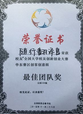我校外语学院吴新燕老师及其团队成员郑梦娜、王睿、王芳、谢乔乔、刘悦、周建华、耿继东等共同策划的创新项目“随行翻译官”,前期在安徽省比赛中,与来自中国科技大学、合肥工业大学、安徽大学、合肥学院等高校的团队激烈竞争,一路披荆斩棘,荣获晋级华东区决赛的资格。11月27日,该团队“随行翻译官”创新项目在首届全国校友+创新创业华东赛区总决赛中,又与来自南京大学、安徽大学、苏州大学等41个优秀创业项目同台激烈对决,脱颖而出,最终以第七名的好成绩荣获华东赛区总决赛最佳团队奖暨全国百强。(撰稿、摄影:吴新燕 编辑:隋欣)