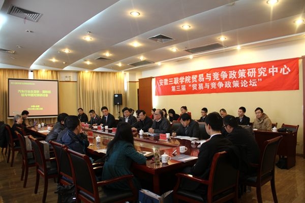 12月12日,由我校贸易与竞争政策研究中心、安徽大学经济法制研究中心、安徽省经济法学会和安徽省汽车行业协会联合主办的“汽车行业反垄断:国际经验与中国对策”研讨会在肥召开。这也是我校贸易与竞争政策研究中心近年来举办的第三届贸易与竞争政策论坛。