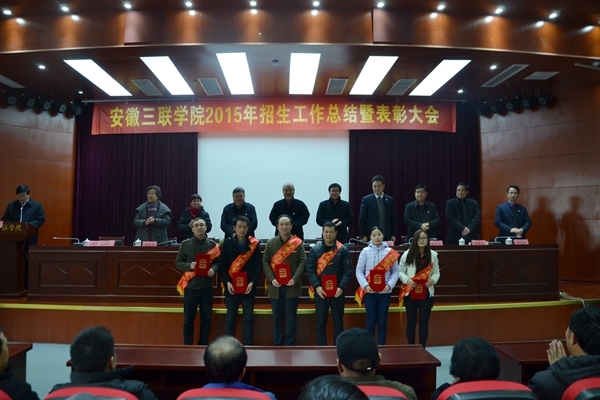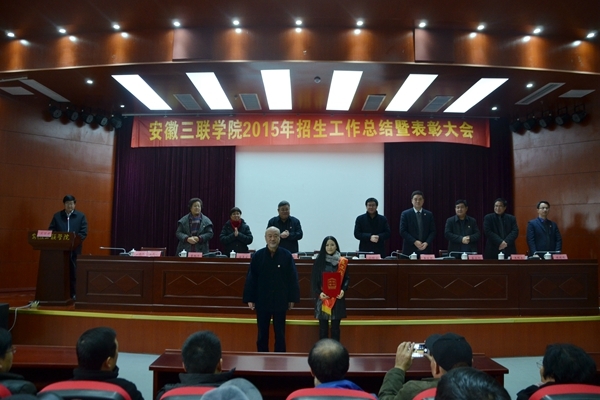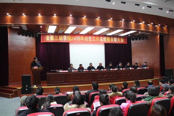 元月13日下午,我校2015年度招生工作总结暨表彰大会在图书馆学术报告厅隆重召开。安徽三联学院校长金会庆教授出席会议并作重要讲话,三联集团执行总裁、安徽三联学院董事长余皖生同志,省教育督导专员、安徽三联学院党委书记李明阳同志以及在肥校领导姜发根、金美莲、秦永元、曹艳平、王瑞友、操晓峰参加会议。会议由校党委副书记鲁先长主持。