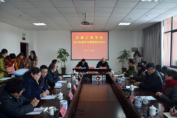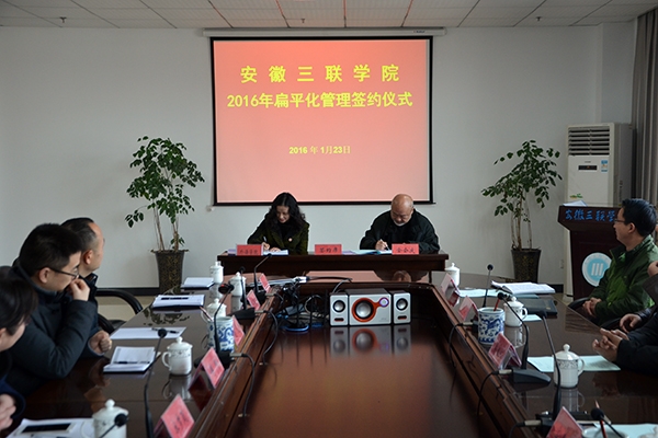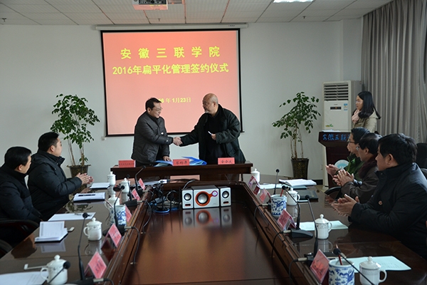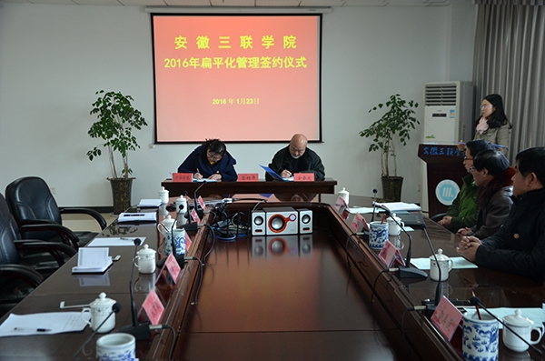 1月23日上午,学校在图书馆518会议室举行了2016年度扁平化管理签约仪式,校长金会庆教授出席签约仪式,分别与九个二级学院的扁平化管理责任人签订目标责任状,并发表重要讲话。省教育督导专员、校党委书记李明阳及在肥校领导参加签约仪式。