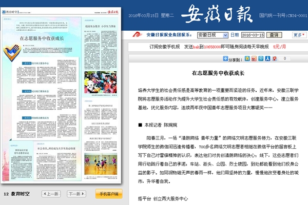 3月15日,安徽日报教育时空专栏中,以《在志愿服务中收获成长》为题,对我校将志愿服务活动作为提升大学生社会责任感的有效载体,创建服务中心,建立服务基地,优化服务内容,并连续两年获评中国青年志愿服务项目大赛银奖的主要情况,进行了全面报道,随后人民网等多家媒体纷纷转载。