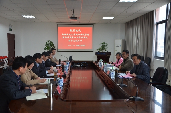 3月29日,安徽建筑大学城市建设学院张伟林院长一行来我校考察交流。校领导鲁先长、王瑞友及综合办、党办、师资处、学生处等部门负责人参加此次交流会。