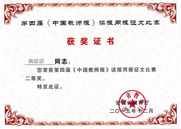 由安徽省教育厅和中国教师报社联合举办的安徽省第四届《中国教师报》读报用报征文比赛评选结果近日揭晓,我校护理学院姚媛媛老师的《常掸思想灰尘 守住内心宁静》荣获二等奖。