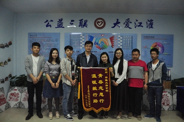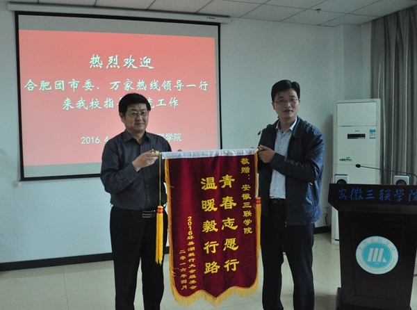 4月13日,组委会领导合肥团市委副书记童友好专程来校赠送锦旗,校党委副书记鲁先长代表学校接受。