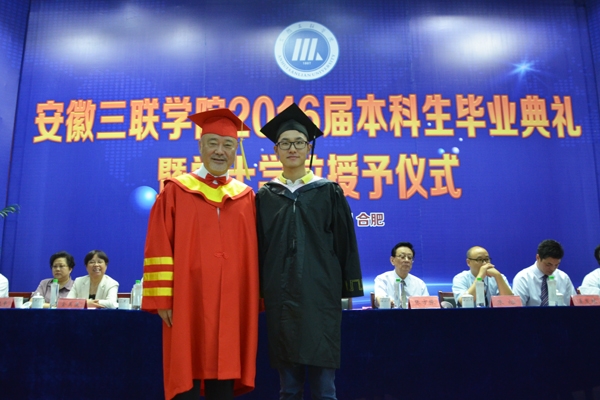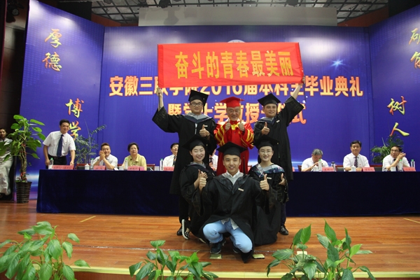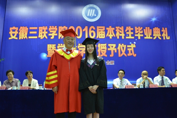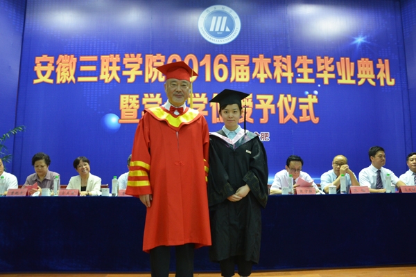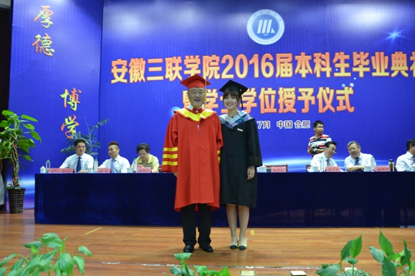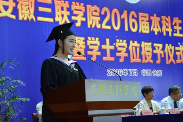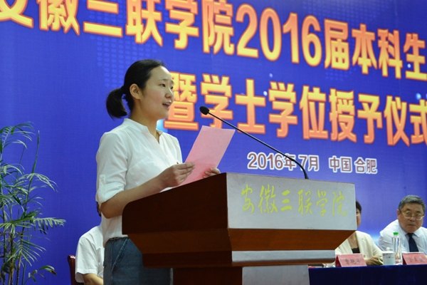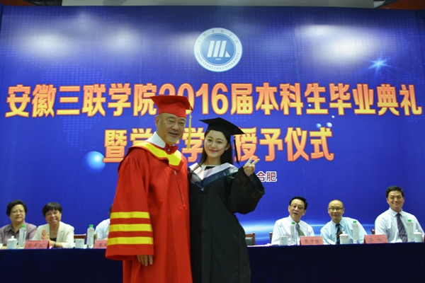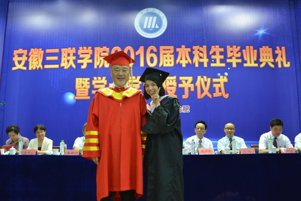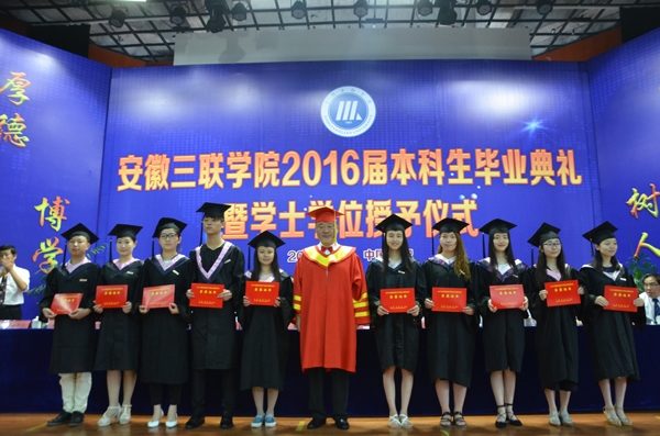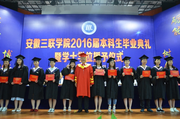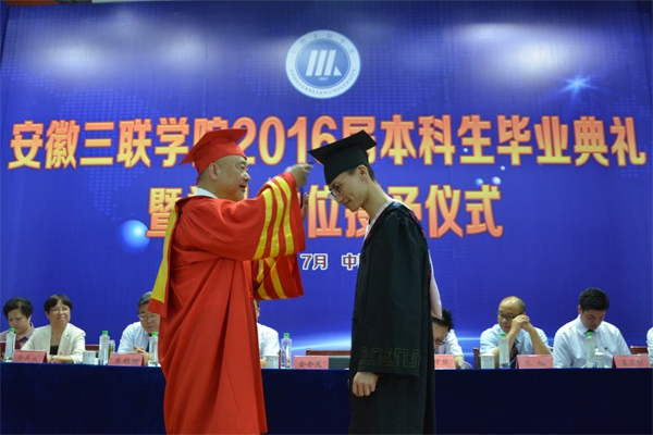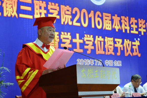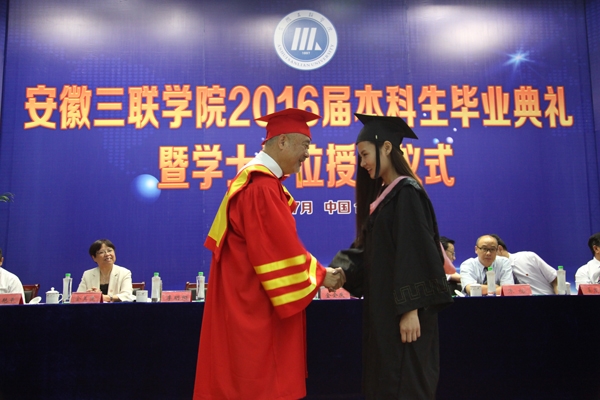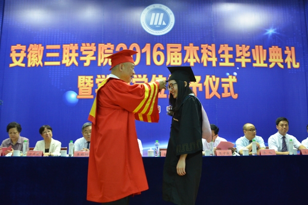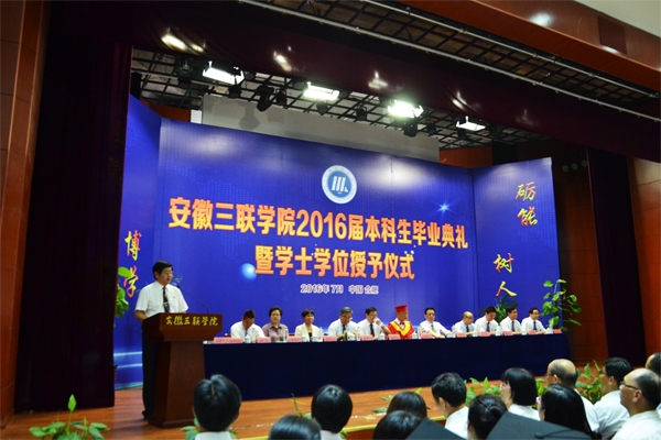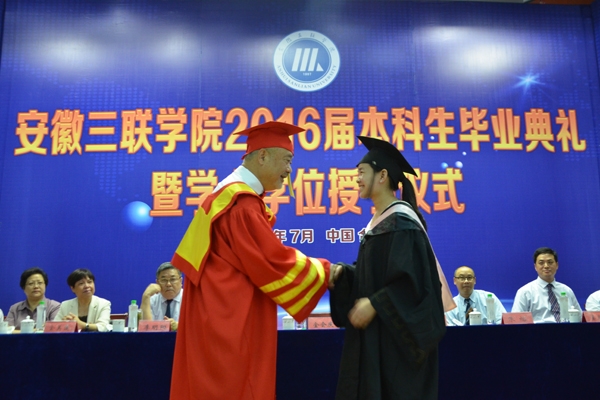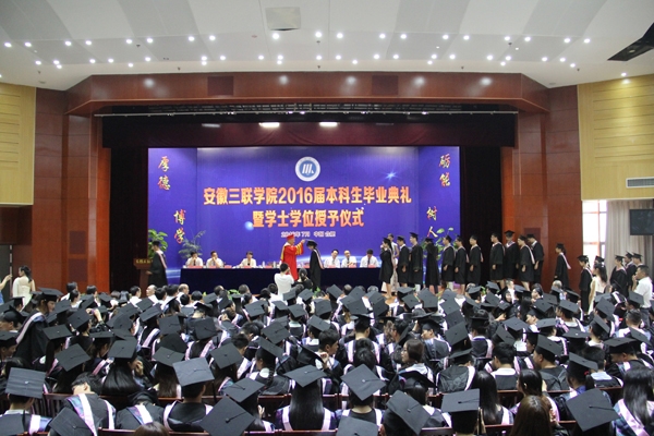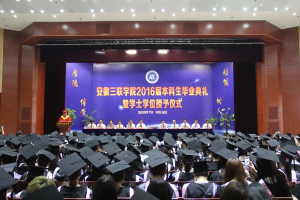骊歌响起,别情依依。安徽三联学院2016届本科生毕业典礼暨学士学位授予仪式按照文理专业分别于7月12日、13日在图书馆多功能厅隆重举行。校长、校学位评定委员会主席金会庆教授,三联集团及学校党政领导张方振、余皖生、李明阳、鲁先长、姜发根、金美莲、秦永元、曹艳平、王瑞友、金哲、操晓峰,各二级单位负责人及教师代表出席典礼,安徽三联学院2016届两千多名本科毕业生参加典礼。典礼由校党委副书记鲁先长及副校长姜发根分别主持。