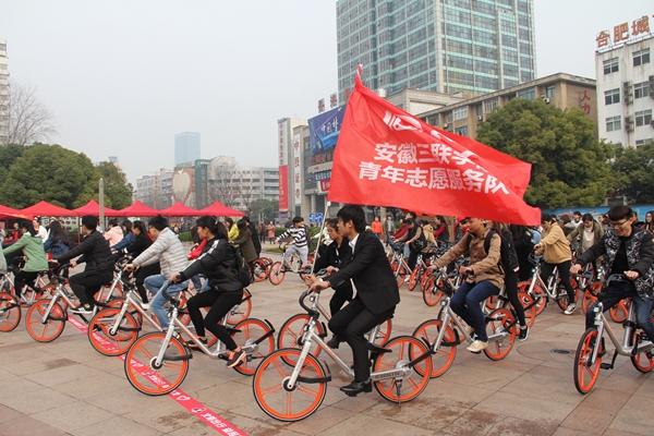 上午,校团委书记李燕带领我校80名志愿者,受邀参加由合肥市文明办、团市委、庐阳区政府主办的“志愿庐州 文明益起”“青春助力文明创建”青年志愿服务启动仪式。活动现场,省市领导为我校青年志愿者服务队授旗,在志愿者宣读完“文明出行”倡议书后,“文明出行 益起出发”志愿服务活动在庐阳区人民广场和地铁大东门站同步开展,我校志愿者“骑”动摩拜单车至地铁大东门站现场开展志愿服务活动。