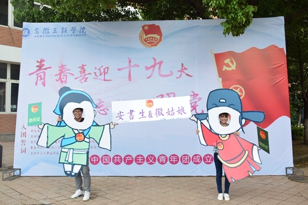 启动仪式上,团省委的两个吉祥物手持团员证第一次以实物的形式展现在广大同学们的面前,受到了同学们的热烈欢迎,吸引不少同学与之合影留念,吉祥物命名为“安书生”和“徽姑娘”寓意深刻,体现安徽特色,彰显安徽青年不断奋发向上、积极向前的精神风貌,同样是活动的亮点之一。
