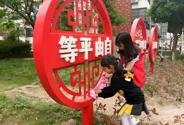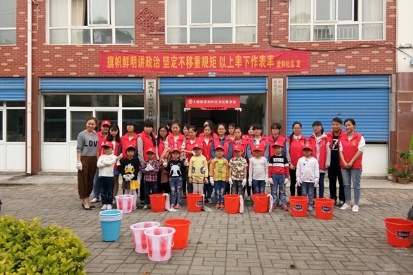 外语学院青年志愿者服务分中心组织30名志愿者在爱和社区带领爱心之家的小朋友参加社区宣传栏清理活动。