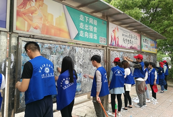 经济管理学院青年志愿者服务分中心组织清理生活区宣传栏小广告活动。