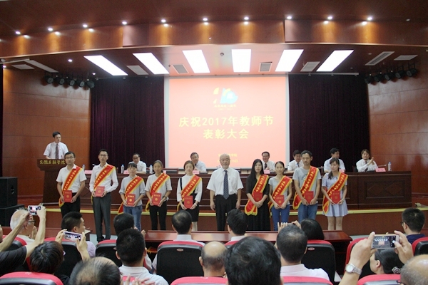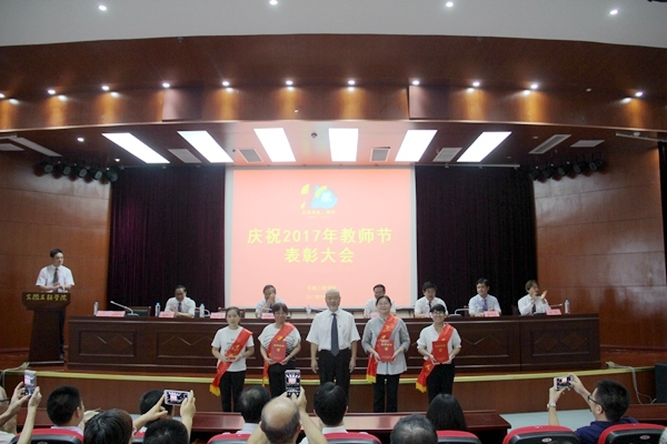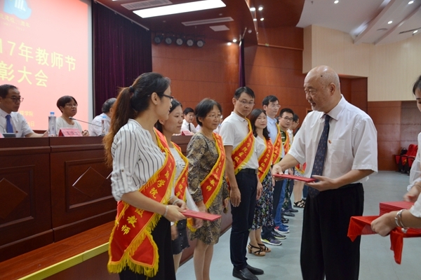 金会庆校长为获奖教师一一颁发荣誉证书。表彰环节的最后,省教育督导专员、校党委书记李明阳特别为校长金会庆教授颁发了安徽省教学名师荣誉证书。
