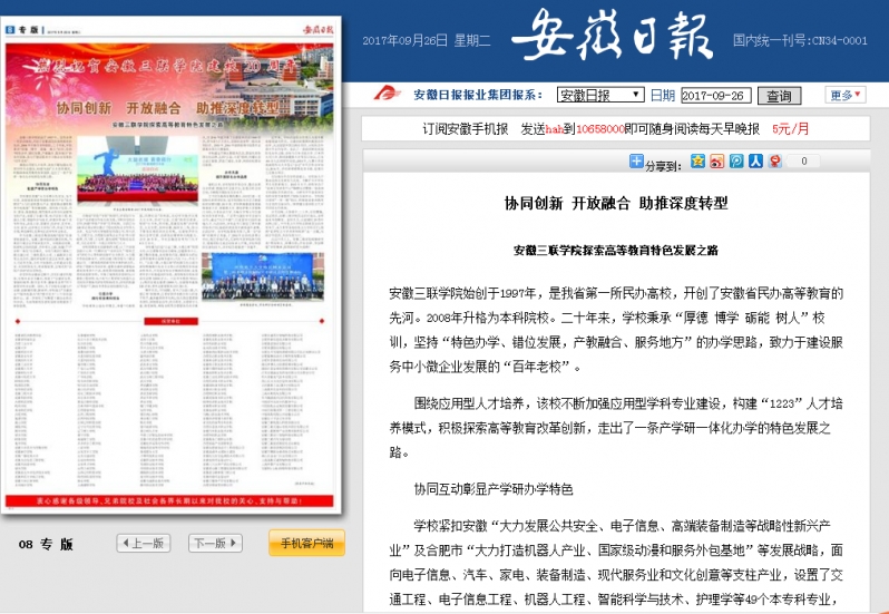 安徽三联学院20周年校庆受到社会各界的广泛关注和祝贺,共收到等省内外高校、合作单位贺信181件。安徽日报专刊登载了祝贺单位,衷心感谢各级领导、兄弟院校及社会各界长期以来对我校的关心、支持与帮助!(编辑:校综合办 王卉)