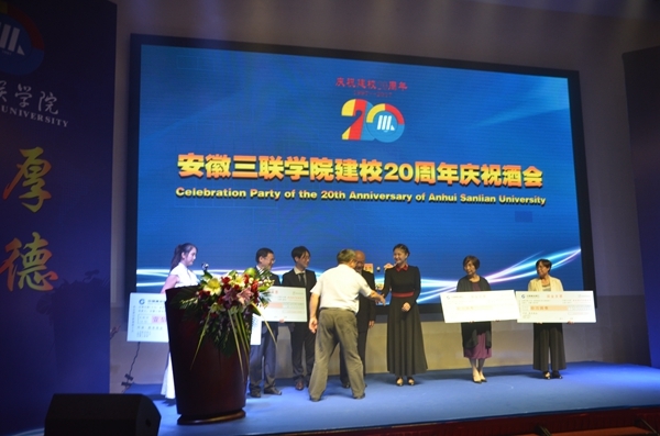 值此校庆之际,金会庆教授等个人发起成立非公募性质的“安徽三联学院教育发展基金”。安徽三联学院校长金会庆教授、安徽三联学院董事金磬、三联机器人公司董事金阳娃、安徽三联学院董事长余皖生、安徽三联学院原副校长金妙莲及安徽三联学院副校长金美莲等6位发起人代表上台进行个人捐赠。安徽省教育督导专员、校党委书记李明阳同志代表安徽三联学院接受捐赠,并合影留念。