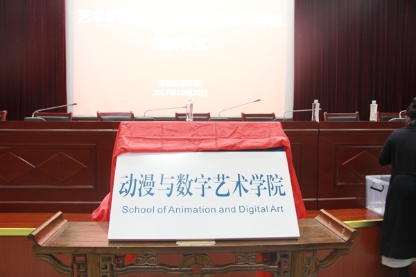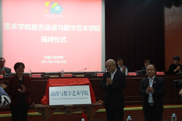 2017年10月20日,安徽三联学院艺术学院更名动漫与数字艺术学院揭牌仪式在图书馆学术报告厅隆重举行。省文化厅产业处处长蔡小莉、校长金会庆教授、省教育督导专员、校党委书记李明阳、艺术学院执行院长孙义共同为动漫与数字艺术学院揭牌。上海联岸信息科技有限公司、合肥科硕信息技术服务有限公司、腾讯天美工作室上海产品中心、上海申磬产业有限公司、合肥乐堂动漫信息技术有限公司、合工光魔有限公司等公司负责人应邀出席揭牌仪式。全体校党政领导、校副处级及以上人员,动漫与数字艺术学院教师、辅导员及学生代表参加仪式,揭牌仪式由副校长姜发根主持。