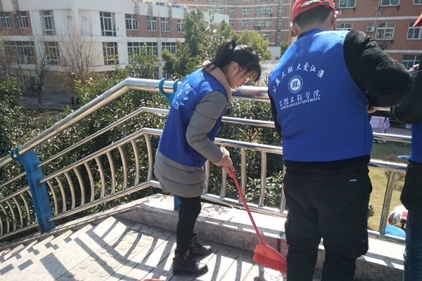 3月5日中午,青年志愿者们在学校生活区,开展了打扫卫生死角、擦洗宣传栏等“清洁校园”志愿服务活动。他们带着毛巾、扫帚、拖把等清洁用具,重点清扫生活区公共区域的卫生死角,将宣传栏上的广告一一撕掉,细心擦洗上面的灰尘;将天桥上、草坪上的垃圾认真清扫,为同学们营造一个舒适的学习和生活环境,校园里随处可见志愿者忙碌的身影。