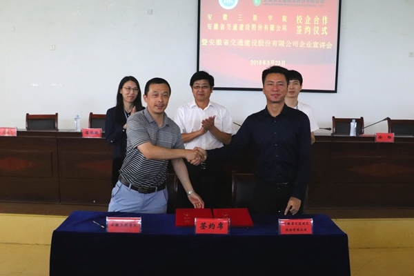 5月23日下午,我校交通工程学院与安徽交通建设股份有限公司(以下简称“安徽交建”)校企合作签约仪式在B01报告厅举行。出席仪式的有安徽交建副总裁吴学懿、人力行政中心专业经理吴海燕等;校党委副书记鲁先长、就业创业处处长王根杰、交通工程学院执行院长凤鹏飞、交通工程学院学管副院长鲁旗会。交通工程学院近300名学生代表参加了仪式。签约仪式由就业创业处处长王根杰主持。