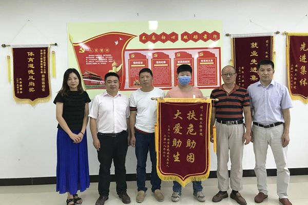 6月22日中午,我校2017级学生钱磊的父亲满怀感恩之心,向我校赠送“扶危助困,大爱助生”锦旗,以此感谢全校师生对孩子无私的关爱与帮助。