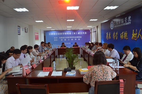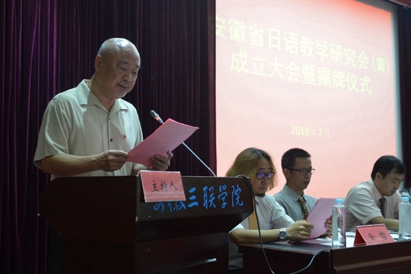 由安徽三联学院承办的“安徽省日语教学研究会(筹)成立大会暨揭牌仪式”于7月7日在安徽三联学院图书馆学术报告厅隆重举行。来自省内开设日语专业的13所本科高校、5所高职高专院校以及其他设置有二外日语的高校共计30名从事日语教学的领导专家应邀出席了大会。安徽三联学院校长金会庆教授、校党委副书记鲁先长、副校长张世伟、校长助理江秀丽等出席会议,大会由副校长金哲主持。