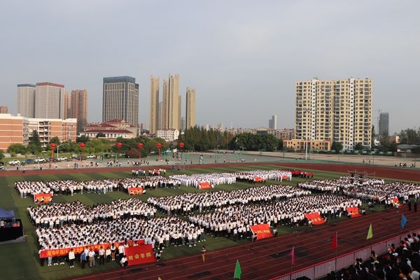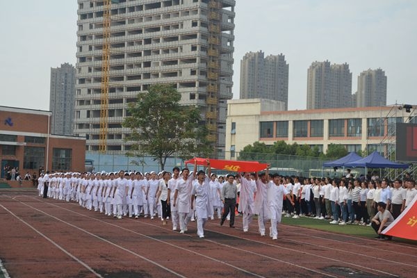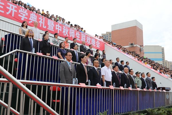 开学典礼在庄严的国歌和校歌声中拉开序幕。紧接着,全体新生入场,伴随着欢快的音乐,各学生方阵步伐整齐划一,口号高亢嘹亮,同学们激情似火,青春洋溢。
