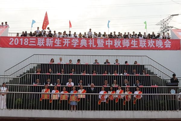 金秋的三联校园,叠翠流金,美丽宜人。9月22日,2018三联新生开学典礼暨中秋师生联欢晚会在安徽三联学院主校区体育场隆重举行。下午16时,第一阶段活动“2018三联新生开学典礼”正式开始,三联集团及安徽三联学院主要领导金会庆、张方振、余皖生、王江波、罗文其、朱熔、潘涛、金磬,三联集团所属兄弟单位有关领导出席典礼,陆军炮兵防空兵学院虞钡铭少校应邀出席典礼,安徽三联学院、安徽红十字会卫生学校、安徽三联汽车学院等在肥校领导、教职工代表及全体2018级新生参加典礼。典礼由安徽三联学院党委副书记鲁先长主持。